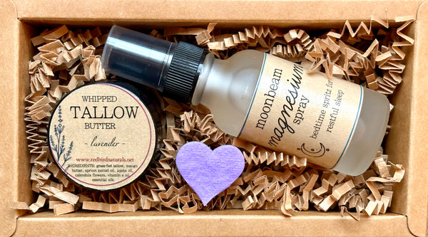 Settle in for a night of comfort and deep sleep with the gift of Moonbeam Magnesium Spray (1 ounce) and Lavender Whipped Tallow Butter (1 ounce). This self-care set is a beautiful gift for those who experience troubled sleep or wish to ease the stressors of the day. It’s also perfect for parents seeking a gentle way to help their little ones relax and sleep more soundly.